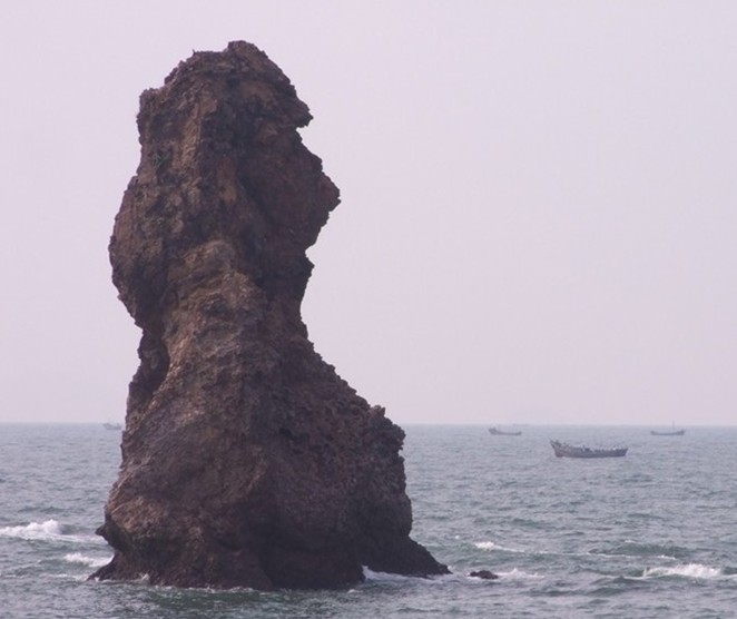 在午山脚下临海断崖南侧,距岸百米处有一座17米高的石柱,形如老人坐在碧波之中