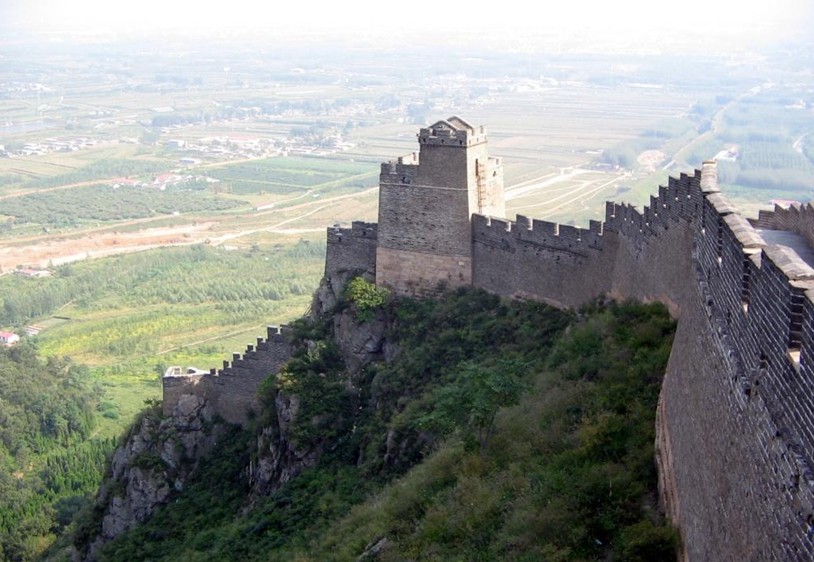 角山景区集山、城、寺为一体。大门是仿明代城堡建筑形式设计的。其造型像个“山字”。正额“角山长城”匾是原国务院副总理、中国长城学会会长黄华题写的,背额“碧海峰”匾为当代诗人贺敬之的手笔。有诗云:“自古尽道关城险,天险要隘在角山,长城倒挂高峰上,俯瞰关城在眼前。”足以证明角山的险要。角山长城是明朝辽东镇和蓟镇两座军事重镇的界线,建有敌台、战台5座,关隘一座。站在角山最高峰大平顶上,极目远眺,令人遥想到当年古战场上战鼓齐鸣、刀光剑影的壮阔场面。
