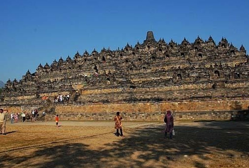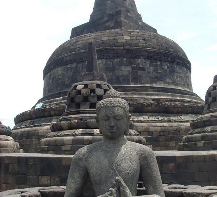 婆罗浮屠位于印度尼西亚,大约于公元750年至850年间,由当时统治爪哇岛的夏连特拉王朝统治者兴建。“婆罗浮屠”这个名字的意思很可能来自梵语"Vihara Buddha Ur",意思就是“山顶的佛寺”。后来因为火山爆发,使这佛塔群下沉、并隐盖于茂密的热带丛林中近千年,直到19世纪初才被清理出来。与中国的长城、印度的泰姬陵、柬埔寨的吴哥窟并称为古代东方四大奇迹。