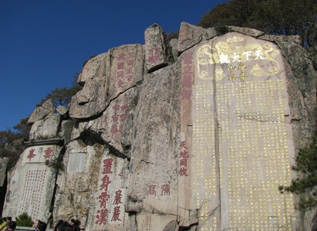 大观峰和云峰上题刻遍布,版权所有山东聊城聊之旅国际旅行社有限公司,转载必究!重重叠叠,能识者80余处。“天日苍茫”、“呼吸宇宙”、“置身霄汉”、“青碧丹崖”等大字与《纪泰山铭》辉映;唐刘仁愿、宋赵明诚、元徐世隆、明朱衡、清阮元及施闰章等历代名流题刻历历在目。