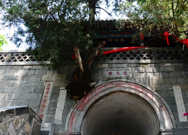 清嘉庆六年即公元1801年泰安太守崔映辰题联:“壶天日月开灵境,盘路风云入翠微。”嘉庆二十一年即公元1816年泰安府事廷璐又联:“登此山一半已是壶天,造极顶千重尚多福地。”这里海拔为800米,大致是泰山高度的一半,门洞有双柏自墙中横生,东西对峙,盘旋而上,宛如守护山门的雷祖、真武二将军,堪称奇景。