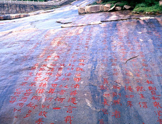 经石峪位于泰山斗母宫东北,有岔路盘道相通,过漱玉桥、高山流水亭、神聆桥即至。峪中有缓坡石坪,上刻隶书《金刚经》,俗称晒经石,明隆庆年间万恭书刻“曝经石”。