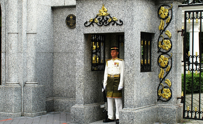 简单的皇宫门口是由一扇并不是很宽敞的铁门与旁边的小岗亭与小门洞组成。仅仅就这一小片风景,就让游客迷恋不已。铁门是用黑色作底色,衬以金黄色作为装饰,典雅大方,从严肃中透出一种高贵。在铁门的侧边的岗楼和岗楼旁的门洞中,各有一名哨兵站岗,在岗楼中的哨兵身穿白色上衣配有绿色前裙的制服,手持长枪;在门洞中的哨兵,则穿一件红色上衣,黑色长裤,胯下骑一匹黑色高马,威风凛凛,常常吸引无数镜头。另外,不时在门口还会站有一排杠枪哨兵供人们拍照留念,闪闪的长枪在阳光的照射下与远处阿拉伯风格的皇宫金顶遥相呼应,分外亮丽。