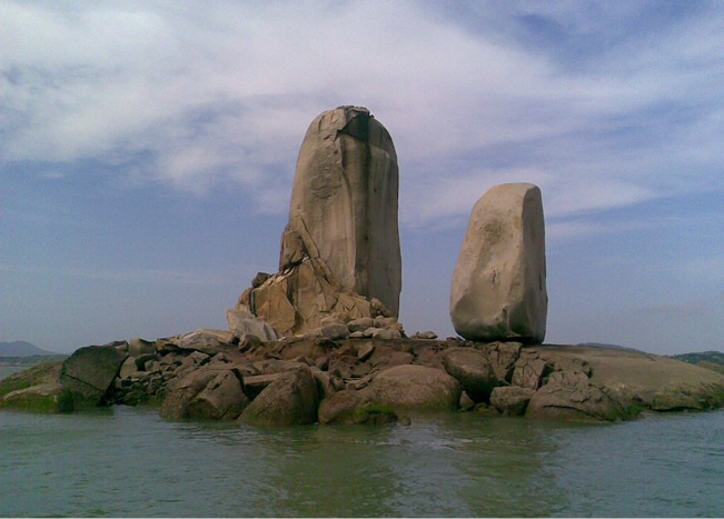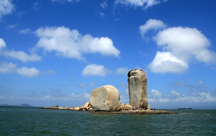 从看澳村岸边坐渡船,十几分钟就到达礁石上,礁石底部是一组平坦完整的岩石。两个石柱均由粗粒灰白色的花岗岩组成 东侧的一个高达33米,胸宽9米,厚8米;西侧的一个高17米,胸宽15米,厚8米。版权所有山东聊城聊之旅国际旅行社有限公司,转载必究!两个石柱的底部都是近似四方形体,直立在礁石上。据地质学家考证是世界上最大的花岗岩球状风化海蚀柱。由于它的奇特壮观,对游人有着强烈的震撼力和吸引力。建设部与中科院的专家称之为:“垄断性的世界级旅游资源。”明代旅行家陈第曾誉之为“天下奇观”, 清朝女诗人林淑贞诗赞:“共说前朝帝子舟,双帆偶趁此句留;料因浊世风波险,一泊于今缆不收.