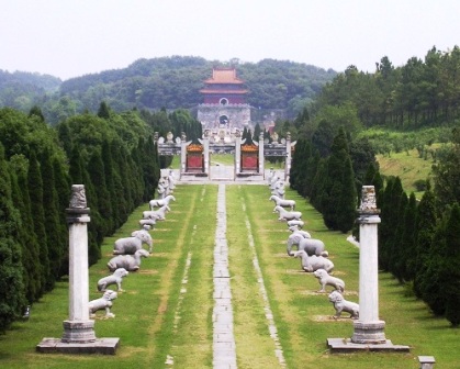 石雕群 是陵前放置的石雕人、兽,古称石像生(石人又称翁仲)。从碑亭北的两根六角形的石柱起,至龙凤门止的千米神道两旁,整齐地排列着24只石兽和12个石人,造型生动,雕刻精细,深为游人所喜爱。其数量之多,形体之大,雕琢之精,保存之好,是古代陵园中罕见的。石兽共分6种,每种4只,均呈两立两跪状。将它们陈列于此,赋有一定含义。例如,雄狮威武,而且善战;獬豸为传说中的神兽,善辨忠奸,惯用头上的独角去顶触邪恶之人。狮子和獬豸均是象征守陵的卫士。麒麟,为传说中的"仁兽",表示吉祥之意。骆驼和大象,忠实善良,并能负重远行。骏马善于奔跑,可为坐骑。石人分勋臣、文臣和武臣,各4尊,为皇帝生前的近身侍臣,均为拱手执笏的立像,威武而虔诚。在皇陵中设置这种石像生,早在两千多年前的秦汉时期就有了。主要起装饰点缀作用,以象征皇帝生前的仪威,表示皇帝死后在阴间也拥有文武百官及各种牲畜可供驱使,仍可主宰一切。
