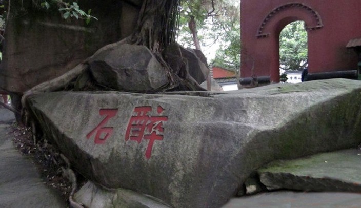 鸣弦泉左,有一斜立巨石。旧传李白曾来这里饮酒听来,乐而忘返,醉卧此石。故名“醉石”。