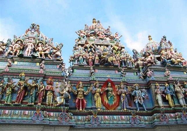 维拉玛卡里雅曼兴都庙(Sri Veeramakliaman Temple)建于1855年。特殊的彩绘门楼属典型的南印度建筑风格,门上高耸的塔楼上装饰许多立体的彩色神像,庙里则是供奉主掌生死的"卡莉女神"(Kali)。雕刻在门楼上的印度教诸神与圣物牛、斗士等,在太阳的照耀下闪闪发光,耀人眼目。寺庙周围的墙壁,都被涂成红白色,极富喜庆气氛。