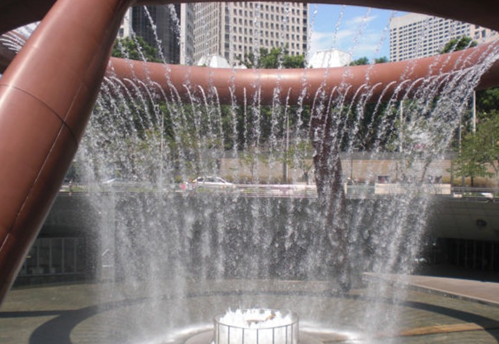 财富喷泉是由四根倾斜的青铜巨柱组成,柱顶是一个直径66米的青铜圆环,整个结构垂直高度13.8米。整个喷泉占地1683.07平方米,喷出的水柱可达30米。