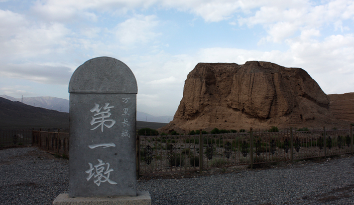 长城第一墩是明代万里长城西端起点,也是长城沿线建筑规模最壮观、保存最完整的一座古代军事关隘。长城第一墩,又称讨赖河墩,是嘉峪关西长城最南端的一座墩台,也是明代万里长城最西端的一座墩台。长城第一墩于明嘉靖十八年(公元1539)年由肃州兵备道李涵监筑,北距关城7.5公里,墩台矗立于讨赖河边近56米高的悬崖之上。对于它的雄险,著名长城专家罗哲文先生曾经有过生动的吟咏:“嘉峪关,雄险画皆难,墩堡遥遥相互望,长城道道连关山,猿臂也难攀”。在一万多华里的明代长城线上,墩台无数,密如繁星,而嘉峪关长城第一墩与河北山海关渤海之滨的“老龙头”遥相呼应,共同构筑起中华长城“龙”的首尾,成就了中华民族“龙”的美名。如果说长城是中华民族的丰碑,那么长城第一墩就是这座丰碑崛起的地方。现在,这座墩台残高约10米,其底部呈不规则正方形,底宽14米,内部仍呈正方形,长宽均为6米。用黄土夯筑而成,夯土层厚10~20厘米。“长城第一墩”碑文由已故的西路军将领魏传统题写,字迹飘逸洒脱,清秀隽永。