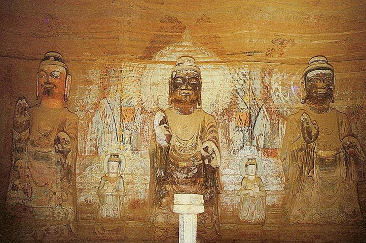 令人赞叹的是那些高大的佛像。165窟内正壁和左右壁雕凿八米高的七尊立佛。这七尊佛像面相方圆,嘴唇厚重,两耳垂肩,体魄雄健,带著北方少数民族气质特徵。而在前壁两边雕凿有五.八米高的两身交脚菩萨;同时佛与佛之间还雕凿有四米高的胁侍菩萨十身;窟门内南北两侧雕凿有三.○五米高的乘象菩萨和三.一米高的三头四臂阿修罗天造像,所有的造像无不表现出北魏时期的北方少数民族特色。