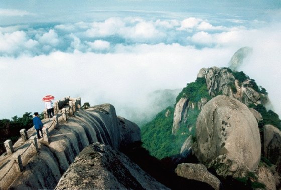 登上天池峰顶,可以领略一下“会当凌绝顶,一览众山小”的气概。这里视野宽阔无比,景色十分壮丽。是观日出、云海、佛光、晚霞的最佳方位。天晴之时,极目远眺,飞来峰、衔珠峰,五指峰,山连天际;炼丹湖如同一面银光闪闪的镜子被潜河、皖水两条银链夹在中间;大龙窝、后山、东关诸峰如同一个个土丘,尽收眼底。