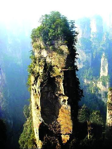 黄石寨南天一柱登黄石寨的途中,约一半的路程处,南天门上行120米.南天一柱又称指天峰,位于天子山索道上站右侧,沿公路下行250米处,一峰依谷而立,冲天而起,柱峰高200余米,下大中细,顶呈锣槌形。峰顶丛生苍松,直指蓝天。