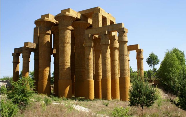 卡纳克神庙是埃及的雄伟高大的建筑群。公元前1870年,埃及法老下令修建了一片庙宇群,它由20多座神庙组成。它是法老敬献给太阳神和月亮神的最高礼物,经过三千多年的风雨侵蚀,现已残缺不全。这些石柱是遗址中具有代表性一部分,石柱上的图纹和象形文字,反映了当时古埃及人劳动、生活、敬神等情景。