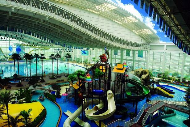 建筑面积约20000㎡,点式玻璃幕墙装饰外墙,南向遮阳百页可调角度,以控制阳光的射入量;跨度达70M的可开启屋顶别具一格。"水空间"项目在亚洲目前是比较先进的以水为主题的水上娱乐场馆,它可以同时容纳5000人在馆内进行娱乐消费。场内设有标准国际比赛游泳池、人工造浪达216种、滑板冲浪、室内太空盆、竞技速滑、漂流河道、生态沙滩、儿童戏水池、家庭互动区及餐饮区、半地下水景,咖啡屋,商品部、休闲区、贵宾间、仿生绿植等。更值得一提的是漂流河有室内和室外部分,夏季互相连通,加上室外泳池和12个温泉泡池,室内外相互交融自然和谐。另外,构思新颖的水中升降舞台还可举办富有民族特色的歌舞晚会、水上婚礼、服装展示等大型活动。