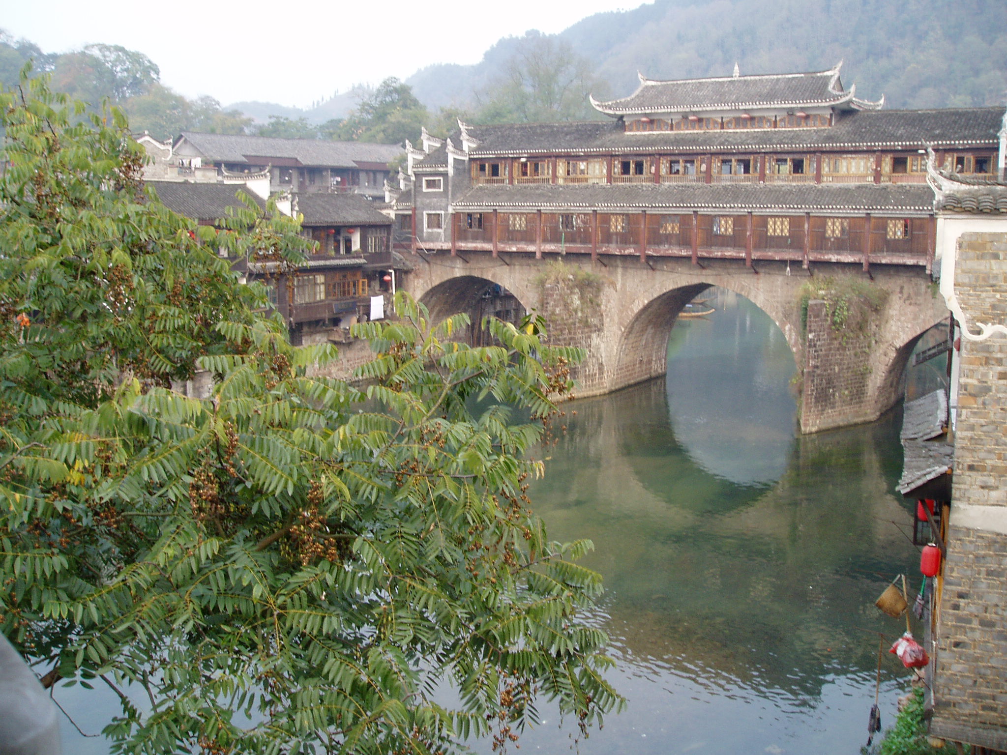虹桥横卧于沱江之上,风雨楼以它的壮观和俊美拔然而起,这其实就是成了一道重叠的风景,这道风景,由下而上、由古而今穿越着六百多年的历史。 这座桥始建于明洪武初年,颇信风水的凤凰人都说,这座桥斩断的是一条龙颈,令一条巨龙身首异处。怪只怪那位和尚出生的安徽小子朱元璋,听信一位从昆仑山开始追索一支龙脉,经云贵高原来到五寨司城的阴阳先生的谗言,说这儿屏立南郊气势非凡的南华山和与之一脉相承一头扎入沱江的奇峰,就是他要寻找的龙头。并由此推断出总有一天这地方会有人出来问鼎中原,真命天子将出。那位朱皇帝岂能允许边远的凤凰有他潜在的对头于是朱笔一勾,龙颈被斩,凤凰风水遭毁灭性破坏,凤凰再也出不来皇帝了。