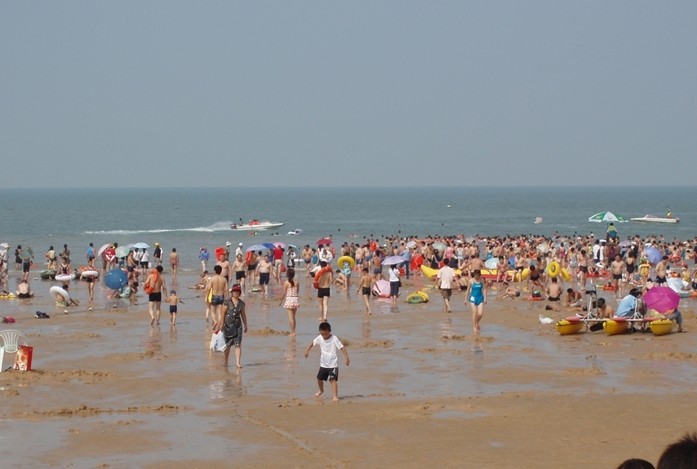 沙滩下帐篷、太阳伞鳞次栉比,海水中泳衣五颜六色,犹如给大海镶上了一道美丽的花环。