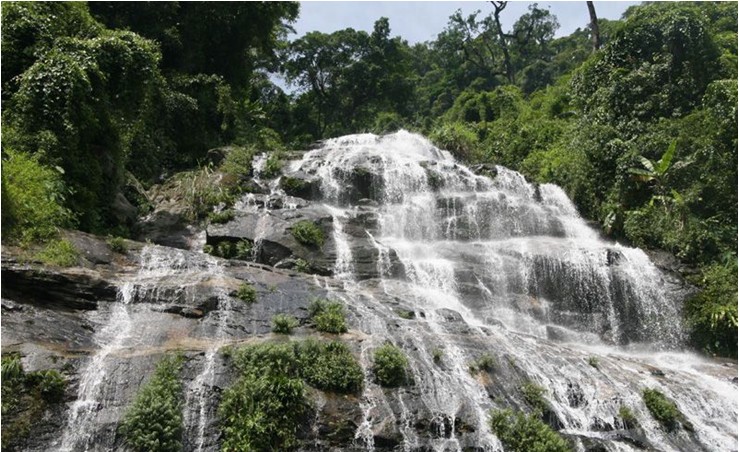 登上百花岭观瀑亭,便可欣赏到那直泻的飞流,犹如飘拂的银链悬挂在山间,呈三级跌宕泻下,哗哗作响,周围烟笼雾绕,景色奇特而壮观。此瀑布因百花岭而得名,其源头在百花岭的海拔700米的第二峰,含纳众汇,集水面近2平方公里。溪涧两旁长满茂密的原始森林,地面积被层厚,地下潜流充足,长年水流不歇,流水落差达300米,地势跌宕,遂成三级飞瀑,而且一级一个景观,各具特色。