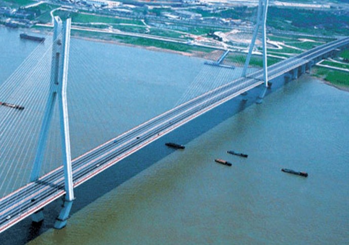 江阴长江公路大桥,悬索桥结构。主跨1385m。门式钢筋混凝土塔柱,柱高193m,中设横梁三道。为目前世界第6、中国第3大桥。94年开工建设,99年10月建成通车。