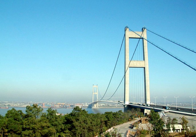江阴长江公路大桥,位于江苏省江阴市黄田港以东3200米的西山,桥型采用主跨为1,385m钢悬索桥。为世界第四、中国第一大桥。1994年开工建设,1999年10月建成通车。