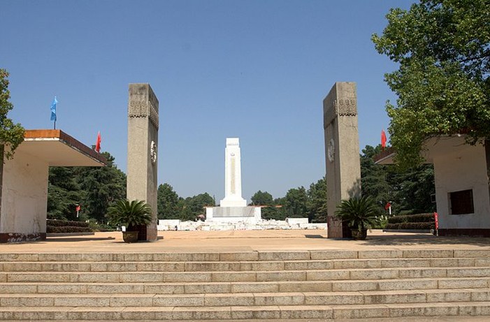 纪念碑前是由红白相间花岗岩铺设的三千多平方纪念广场,广场两边是两排四季常青的苍松翠柏,象征革命先烈千秋永生。