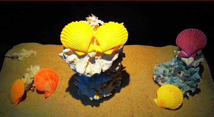 走进贝壳展厅,仿佛走进梦幻般的海底世界。曲径通幽的贝壳展厅以蓝色为设计主调,四壁墙面除陈列贝壳展品用的橱窗外均漫画式的画满各种海藻、水草和海洋生物。地面墙角用鹅卵石和沙子堆积,然后用珊瑚、贝壳、海星、海龟等标本点缀,营造出一种神奇的海底景观。展厅四周的橱窗内陈列了300多种来自世界海洋最具代表性的贝壳,有展翅欲飞的“天使之翼海鸥蛤”、洁白如玉的“白铅螺”、金光灿灿的“黄金宝贝”、色彩绚丽的“澳洲海扇蛤” 、形似眼睛的“猫眼蝾螺”、还有著名的活化石“红翁绒螺”和“鹦鹉螺”…… ,这些形形色色、千姿百态的贝壳在灯光的映衬下就是一件件来自海洋深处的艺术珍品,让游人在观赏之后不仅惊叹大自然鬼斧神工,同时激发他们热爱大自然、保护海洋的情感。