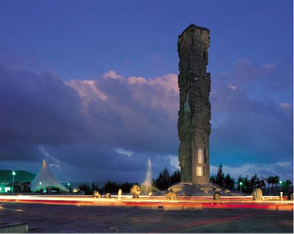 围绕图腾柱的中心雕塑区,形成三圈石砗,气势宏大、形象独特。第一圈有苍龙、白虎、朱雀、玄武四季标识与日晷24节气雕塑;第二圈表现盘古开天地、女娲补天、嫦娥奔月、弄天舞干戚、大禹治水、牛郎织女、后羿射日、夸父追日等八个远古神话;第三圈是反映天文、人、动物、植物万物生灵雕刻。图腾柱和雕塑群浑然一体,构成强烈的中国古天文意识和东方神秘色彩。广场外围设计的五组白色风帆式的尖顶帐篷及大型彩色喷泉,给具有古老文化意蕴的雕塑增添了现代气息。