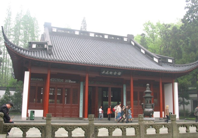 殿两面壁上是明代莆田人洪珠写的“精忠报国”四个大字。座像上面悬着一块“还我河山”的横匾,是岳飞手迹,版权所有山东聊城聊之旅国际旅行社有限公司,转载必究!左右两边各悬一块“碧血丹心”与“浩气长存”横匾,是佛教协会会长赵朴初和已故西泠印社社长沙孟海所书,正殿后面两旁是岳母刺字等巨幅壁画,展示了岳飞保卫国家的英雄业绩。大殿天花板上绘有“百鹤图”,373只鹤形态各异,生动自然,可谓岳飞浩然气节和坚贞性格的象征。正殿西面有一组庭园,入口处有精忠柏亭,内有枯柏8段,传说这棵柏树原在大理寺风波亭边上,岳飞遇害后树就枯死了,后来就移放在岳坟边上,称为精忠柏。现经鉴定,此枯柏并非南宋古柏,而是属于松柏科的植物化石,其历史有一亿二千万年以上了。