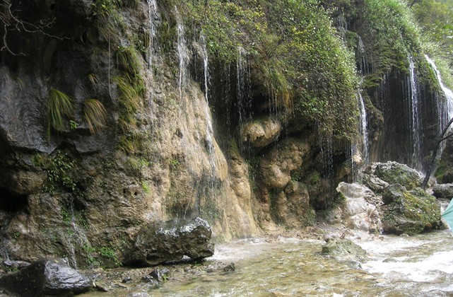 8. 水帘洞,天然洞穴,洞顶为水草石檐,石檐上挂有一条高七八米的珠帘。水珠条条线线如晶莹剔透的珍珠从洞顶垂下。