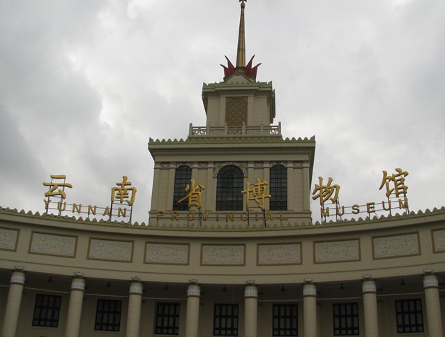 云南省博物馆于1964年建成使用。它是一座主楼七层,两翼三层的宝塔式建筑,通高40余米。大楼一至三层为展厅,面积共4200平方米,前面是12根合抱粗的圆形大柱,屋顶金色刹杆灿灿,红星闪烁,气势雄伟,造型别致。