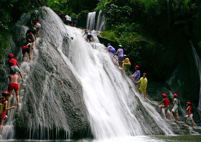 登瀑布是勇敢的活动虽然没有大的危险,但是要游客出体力,跟在别人往往是水溅一身,下水急攀登较难,双脚轮流向上攀登,后面有人催游客,越是想往上爬,越是走不起来,手抓铁链在空中摇摆着;偶尔后边的人会帮上面的人扶一下脚,共同协作攀登困难者,也是团结协作的团队精神;沿小溪而上,水有深有浅,第二道瀑布明显比第一道要小得多,故快速而过,