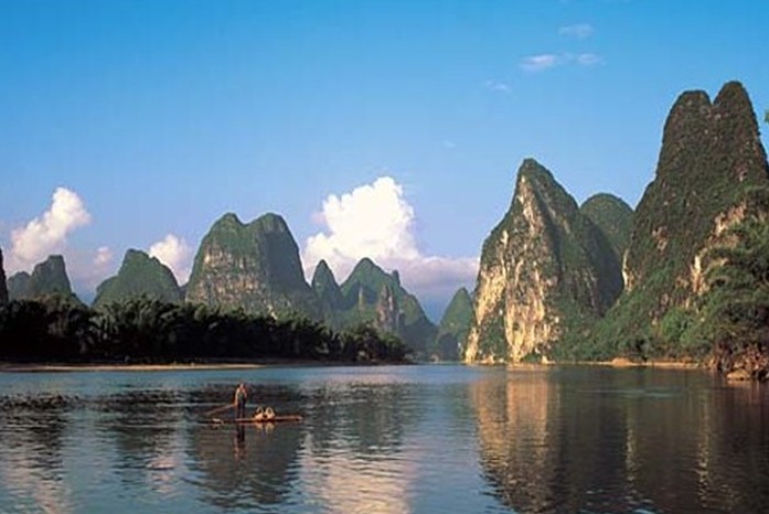 黄布倒影是漓江精华中的精华,位于漓江83公里精华段兴坪古镇境内,游船经过杨堤,过了九马画山,江面逐渐开阔,水平如镜,青峰倒影,美不胜收。离画山之南不远,便是黄布滩。漓江山色之美,美在倒影中;漓江倒影之美,就数黄布滩倒影最为醉人。这里江流清澈,碧绿透底,从水面上可以看到江底有块米黄色的大石板,长、宽各数丈,恰似一匹黄布平铺在河床之上,黄布滩由此得名。