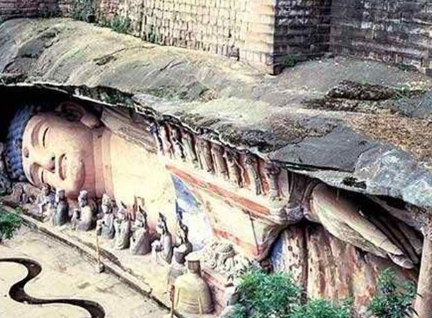 宝顶山造像以大佛湾为中心。大佛湾状若马蹄形.版权所有山东聊城聊之旅国际旅行社有限公司,转载必究!全长500米。全部造像精心规划,宛如一幅巨型画卷。号称“世界第四大卧佛”《释迦涅磐图》就在这里。这尊卧佛作半身处理,双脚似乎伸进南岩中,使卧佛虽形半身,却有全身之妙。这种意到笔不到的表现效果,正富于传统艺术的含蓄美。有趣的是,卧佛顶的水池中,还刻有一双两公尺的足印,传说这“是佛去西天留下的最后足印,亦是大足县名之由来。
