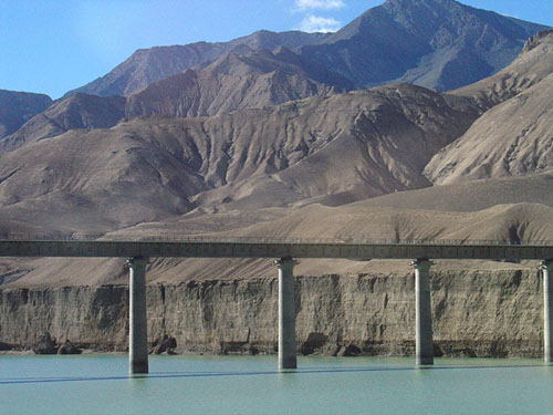 格尔木河上气势雄伟的格尔木水电站被称为昆仑山下的明珠。格尔木河是柴达木盆地南缘的一条大河,昆仑山峰摄的冰雪夏日消融,它挟带着营水奔腾咆哮。它的背后是一个碧波闪闪的人造水库,库容为四百多万立方米;它的前面是一条飞架嶙峋峡谷两岸的凌空铁索天桥,水库的水从大坝的三扇泄洪闸门喷涌而出,犹如霰雪,又似瀑布,玉珠四溅,水雾飞腾。