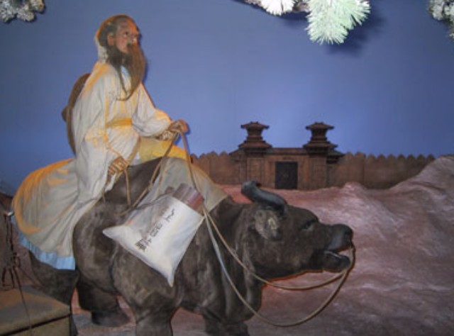 来到我国著名思想家,道德学派创始人,安徽涡阳人的老子展位,只见骑在青牛背上的老子,白发苍苍,目光炯炯有神,正缓缓向前走来,他身旁是挑着行囊的书童。随着呼啸的风声,天空飘起了鹅毛大雪,转眼间便白茫茫一片,眼前“秦界”,函谷关依稀可见。老子手中握着的牛绳一起一落,青牛不断发出“哞哞”的叫声,正向函谷关进发,准备西去流沙。由于展区内的人物、景物采用了光电技术,人物与场景均十分逼真。
