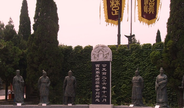公元207年,项羽从谋士范增之计,在鸿门设宴,企图借机杀掉刘邦,于是演出了一幕“鸿门宴”,著名的典故“项庄舞剑,意在沛公”就是指这段故事。现存遗址用青砖砌成,十米高的旗杆上飘扬着杏黄色的帅旗,台子北面建了一座蒙古包似的军帐,门口高挂“楚高军旗”,帐内模拟当时的宴会场面,军帐用玻璃钢制成,里面塑有“项庄舞剑、樊哙闯帐”等塑像,生动的再现了当年战事中的重要一幕。