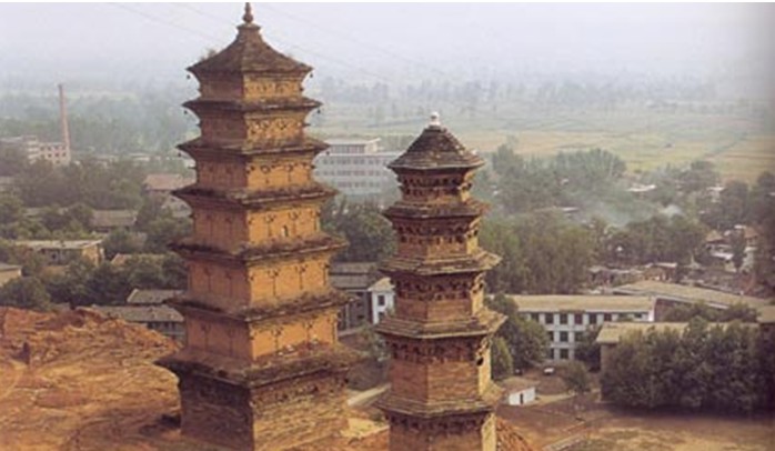 现存的两座塔中,东边的是杜顺的灵骨塔。杜顺(法顺,五五七~六四○年),俗姓杜,雍州万年县(今西安市长安区)人,十八岁出家,皈依因圣寺珍禅师学习禅观。因圣寺也是一座窟洞寺,相传珍禅师修寺时,版权所有山东聊城聊之旅国际旅行社有限公司,转载必究!有一只灵犬在洞内衔土,往返劳而不倦。杜顺一生中,有不少为人治病、除害行善的事迹,受到当时僧俗的崇敬,这对他传法十分有利。唐太宗慕其盛名,引入内宫隆礼崇敬,后妃、王族、贵臣奉之如生佛。杜顺虽是禅师,但又以华严为业,住静终南山,著《华严法界观门》、《华严五教止观》,为华严宗初祖。杜顺圆寂时,有两只鸟飞入房中,悲鸣哀切。杜顺尸身一个月后仍肉色不变,一直有异香飘出,后起塔藏葬。现存的杜顺塔呈方形角锥体,共七层,高约二十一米,为仿木结构楼阁式砖塔。每层叠涩出檐,檐下均砌两层菱角牙子,塔身壁面用砖砌成扁柱、栏额、斗拱、昂等,第三层嵌有"无垢净光宝塔"刻石。