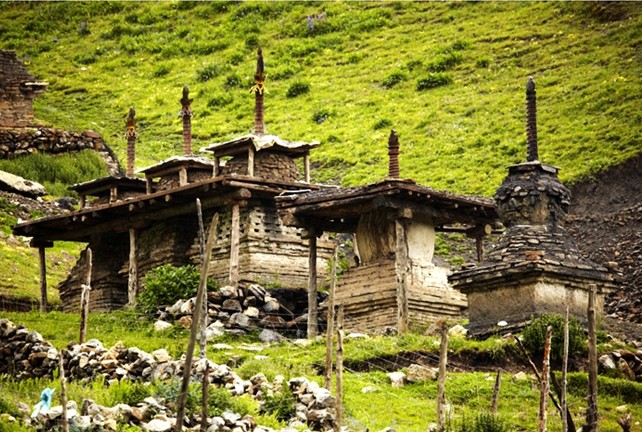 另外,在叶巴经堂的另一小殿中还供放着传为格萨尔念诵的“帕本”经卷,寺院所在达那山西面的龙保山,山顶群石林立,上有传为格萨尔及其部将的墓葬塔,均为噶丹派塔形,上铸各色藏文字,惜因风化雨淋,岩羊舔蹭,字迹已难辨认。一些塔内,有大小不等的泥制塑像,一般4种,最大者白色,次为浅红,再次为深红,最小者为黑色。泥像上均印有近似六字真言的梵文字。
