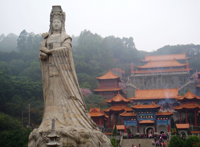 南沙天后宫,紧临珠江出海口伶仃洋,坐落于大角山东南麓,依山傍水,其建筑依山势层叠而上,殿宇辉煌,楼阁雄伟,在天后广场正中就是石雕天后圣像,是为纪念海上女神林默而建,建筑特点是集北京故宫的风格和南京中山陵的气势于一体,其规模是现今世界同类建筑之最,被誉为“天下天后第一宫”,也是东南亚最大的妈祖庙。天后圣像高达14.5 米,屹立在天后宫广场正中。整座天后宫四周绿树婆娑,殿中香烟袅袅,置身其间令人顿生超凡脱俗的感觉。
