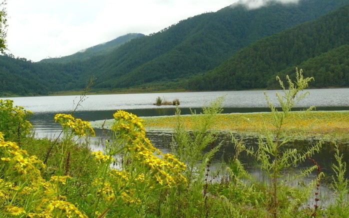 周围的五宝山,森林茂密,野生动植物种类繁多,尤其是原生的云南松林保存了良好的生态环境,池畔环境幽静,周围山峦叠翠,湖光山色融为一体,风光四季不同,使人仿佛置身于变幻的画卷之中。