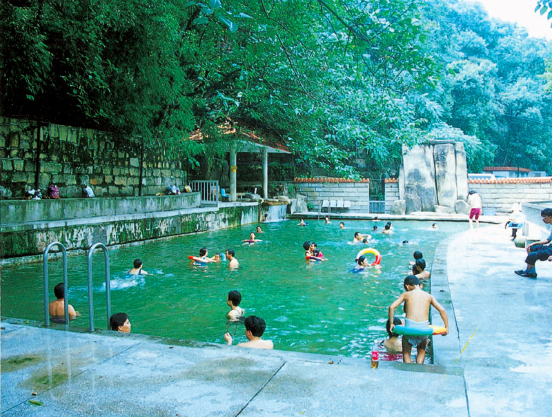 北温泉的水温一般为35℃-37℃,日流量达5675吨,属弱碱性硫酸型矿泉,水中富含多种微量元素,不仅含钙量高,水中还含有稀有的氡元素,对皮肤、关节、肠胃等部位疾病疗病效果极佳。创建公园以后几经扩建,目前已拥有室内浴室75间,长50米、宽16米的国家标准游泳池一个、现又新建了室内游泳三角池和儿童嬉水池。此外,北温泉附近存有唐宋以来的众多题刻,还是中国游泳队的训练基地之一。