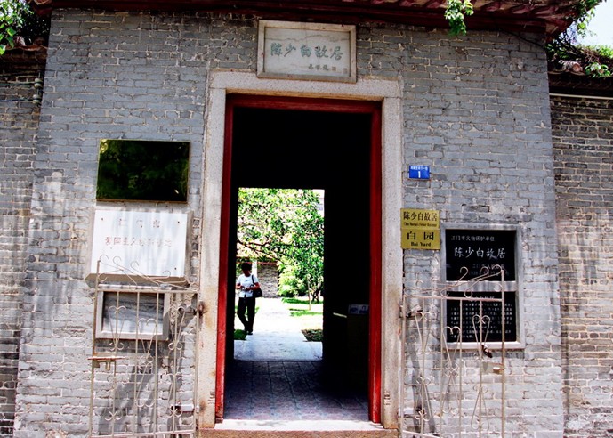 位于江门市江海区外海镇南华里。由陈少白自行设计。故居分两处,隔河相望,以自桥连为一体。桥的一边是"白园",另一边是一座"三合院"式的居所。始建于1929年,1931年落成,占地面积两亩许。自少白逝世后,其家居多旅居外地,楼宇日久失修,渐显颓败。1991年春,外海镇政府拨出巨款?对"白园"和园内的"莎萝坪"、"粥锅亭"、"瞻云台"等建筑,以及"三合院"和院内的"亚字楼"等都一一进行了修复,并在故居内设立"陈少白事迹陈列馆",陈列大量名人字画及历史文物。使故居还其原貌,焕发青春。