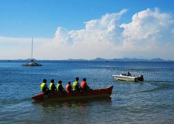香蕉船是惊险、刺激的海上娱乐活动之一。香蕉船形似香蕉状而得名,坐在香蕉船上由一艘快艇以50公里/小时的时速拉着在海上飞驰,随着海浪的起浮,香蕉船犹如一匹脱缰的骏马自由穿梭在碧蓝的大海之中。