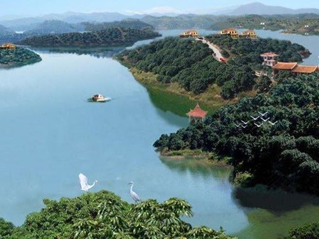 只要登上西湖豪华游艇、飞艇,作环库游。随着飞艇在平静的水面上飞驰,就能看到的是大大小小三百多个库湾,一个个浮在水面的荔枝孤岛,两边山上,一片片翠绿茂盛的是荔枝林。