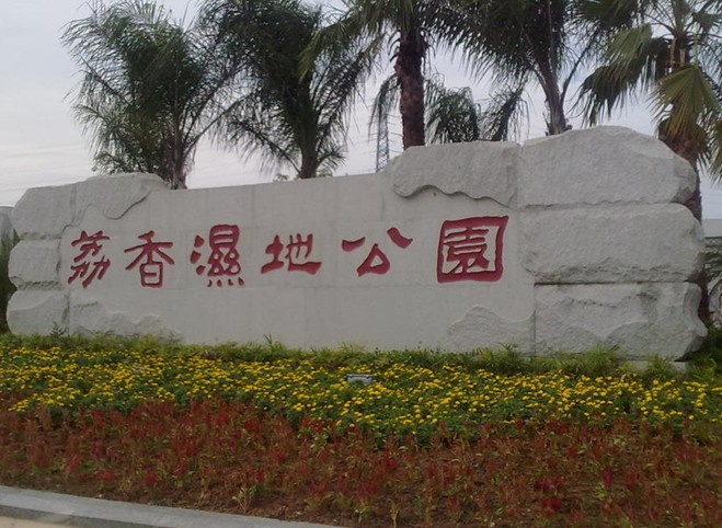 比之中山公园,荔香不及其大,却尤显精巧别致;比之于南山公园,荔香不及其雄,却格外诱人留连。特别是园区北边入口处那座高9.9米的圆形雕塑《南山明珠》,远望像一颗晶莹剔透、光华四射的宝珠,近看却是一颗硕大无朋、清新鲜亮的“荔枝”。上半球面三角形“果肉”凝如碧玉,下半球“荔壳”则是刻满岭南四季风情的浮雕。明珠底部有喷涌不绝的飞瀑相托,广场四周则以层层盛开的鲜花簇拥。远望近瞻,皆成佳景。游人至此,信步其间,如领略一幅描绘南粤风情的山水长卷,如聆听一曲凝聚南国神韵的交响音诗。心醉神迷,叹为观止。