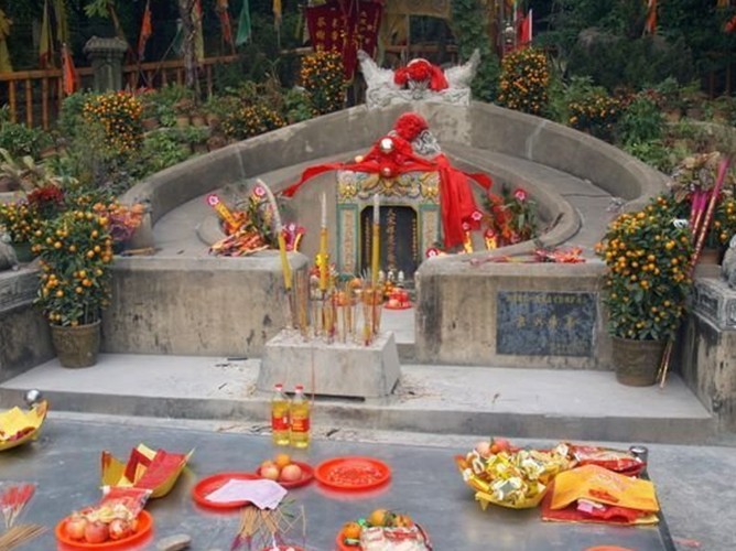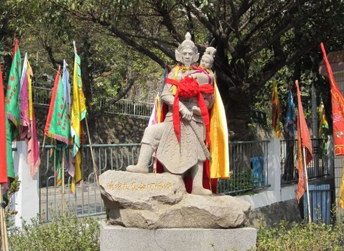 碑后为坟堆,有两重弧形围墙,前段中间顶面塑祥云拱月,涂染朱红,后段顶面塑双龙拱日,下有一只凤鸟装饰。墓的东侧,立有一块泉州白石碑,正面是《宋帝昺陵墓碑记》,记叙了宋少帝的生平、陆秀夫负帝殉海的经过以及陵墓的修建情况,碑文为篆体阴文,风格古拙,是著名书法家商承祚所写。石碑背面则刻有著名书法家秦萼生题笔的八个大字:“崖海潜龙,赤湾延帝”,字体苍劲。陵墓西侧,版权所有山东聊城聊之旅国际旅行社有限公司,转载必究!是一座高约四米的陆秀夫负帝殉海石雕像,民族英雄陆秀夫背负幼主,视死如归,凛然正气,令人肃然。或许,正是陆秀夫这种宁死不屈的民族气节的感召,不时还有世人前来拜祭。在少帝陵前,在陆秀夫像前,摆满了丰盛祭品,萦绕着袅袅香烟……