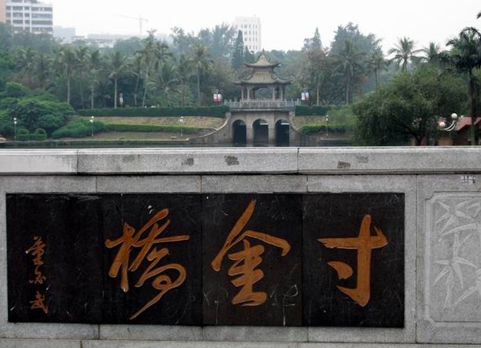 寸金桥位于湛江市赤坎区寸金路原广州湾租界西面界河赤坎河(又称文章河)上。河水连接寸金桥公园月影湖,桥之西为华界,桥之东为租界,是为纪念1898 ━1899年遂溪人民反抗法国强租广州湾的斗争的史志性建筑物。1925年遂溪县麻章区绅民建,原有的“寸金桥”隶书桥名刻石,现存湛江市博物馆。抗日战争时期重修,1959年和1986年扩建,为石砌单拱式水泥桥面桥梁,全长19米、面宽11.6米,单拱园径6.5米,桥面南北两侧各置栏柱,人车分道。桥头东西有董必武、郭沫若题词桥匾,董必武题书“寸金桥”,郭沫若题“一寸河山一寸金”。接着,路改名寸金路,版权所有山东聊城聊之旅国际旅行社有限公司,转载必究!公园改名寸金桥公园,车站和酒家均以“寸金”命名。一九五九年人民政府重修“寸金桥”,并于桥旁立碑(有碑文),从此“寸金桥”成为抗法斗争的一个象征性建筑物。一九六○年,郭沫若到湛江观看粤剧《寸金桥》,题诗有“一寸河山一寸金”之句,“寸金桥”名声更著。 西山公园一九八○年改名“寸金桥公园”(因“寸金桥”在其旁,公园博物馆内有抗法斗争专题陈列)。一九八四年初又于公园内竖立大型雕塑《寸金桥抗法斗争纪念雕像》,参观的人络绎不绝。