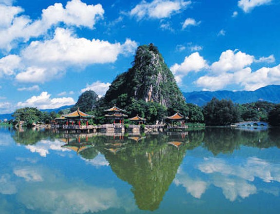 广东肇庆市的星湖风景名胜区,是我国南方著名的旅游胜地。很多游人对它评价很高,认为它兼有杭州西湖和广西桂林的胜景。