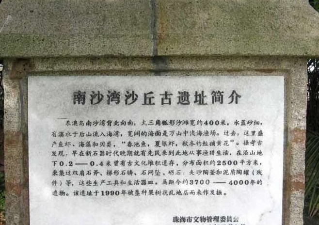 沙湾古遗址位于淇澳岛东部高出海岸的沙丘上,1984年文物普查中在这里发现了新石器时代的彩陶文物,成为广东省境内屈指可数的历史年代较早的古文化遗址之一。