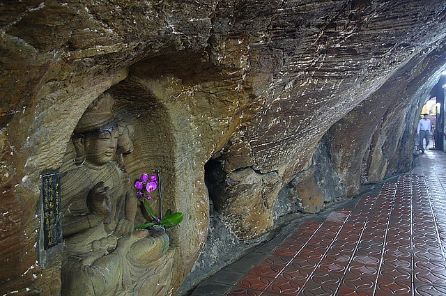 沿着石洞入内,灯光更为昏暗,但仔细看两旁壁上,栩栩如生的石凋佛像,一尊尊的凿壁而居,地藏菩萨、千手千眼观世音菩萨、释迦牟尼佛 ‥贫尊庄严,更是引人入胜。
