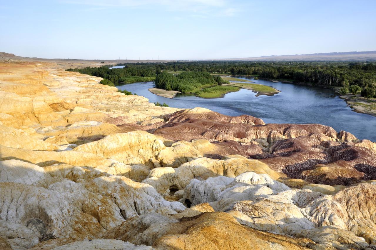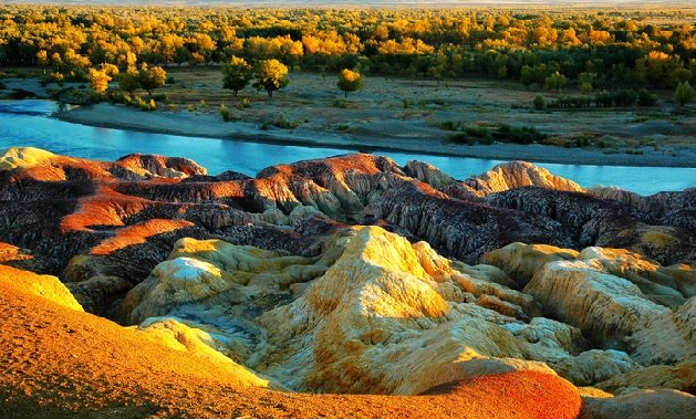 五彩滩位于布尔津县城以北约24公里处,是前往哈巴河县与喀纳斯的必经之路。它毗邻碧波荡漾的额尔齐斯河,与对岸葱郁青翠的河谷风光遥相辉映,可谓“一河隔两岸,自有两重天”。激猛的河流冲击以及狂风侵蚀,形成了北岸的悬崖式雅丹地貌,河岸岩层抗风化能力强弱不一,轮廓便会参差不齐,而岩石含有矿物质的不同,又幻化出种种异彩,因此得名“五彩滩”。 版权所有聊城聊之旅国际旅行社有限公司,转载必究!而南岸却是绿树葳蕤,连绵成林,远处逶迤的山峦与戈壁风光尽收眼底。